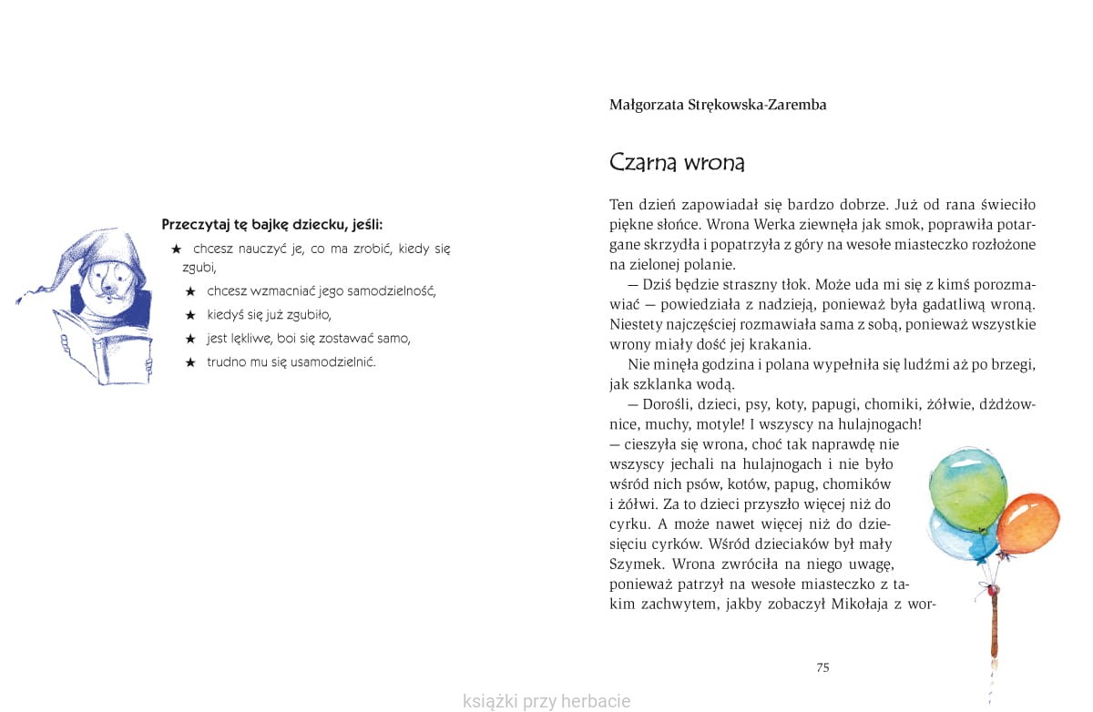 Bajkom towarzyszą wskazówki i komentarze eksperta od bajkoterapii – Katarzyny Klimowicz, które, mamy nadzieję, będą dla rodziców, opiekunów i dzieci pomocą, inspiracją do rozmowy, zabawy czy przede wszystkim wspólnego zastanowienia się nad takimi tematami jak: inność, spotkanie z nieznajomym, bezpieczeństwo nad wodą, zgubienie się, brak wiary w siebie, rywalizacja z rodzeństwem, bezpieczeństwo w domu.