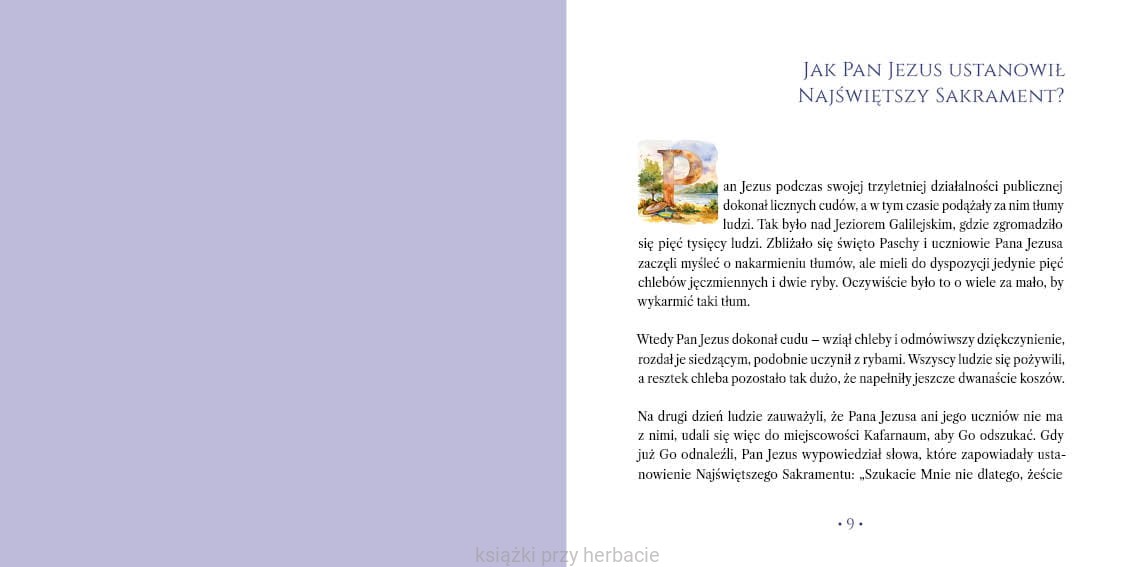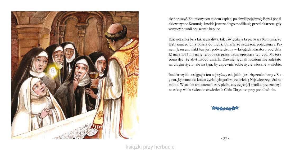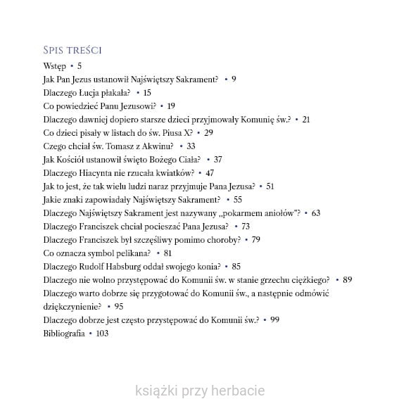 Książka uczy szacunku, skupienia i miłości do Jezusa ukrytego w Sakramencie Eucharystii, a jednocześnie zachwyca pięknem języka. To cenna pomoc w drodze do I Komunii Świętej. Pomaga dzieciom w głębokim przeżyciu święta Bożego Ciała.