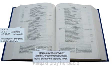 BIBLIA JEROZOLIMSKA Biblia Jerozolimska to wydanie Pisma Świętego w języku francuskim, dzieło zespołu czołowych egzegetów katolickich Francji, kierowanego przez dominikańską szkołę biblijną z Jerozolimy (École Biblique et Archeologique Française de Jérusalem). Inicjatywę i realizację pierwszego wydania, które ukazało się w fascykułach w latach 1948-54 należy przypisać Th.G. Chifflot OP. Wielkie uznanie zyskały zwłaszcza przypisy odwołujące się do hipotezy dokumentów Pięcioksięgu i metody historyczno - krytycznej. W roku 1973 ukazało się nowe wydanie gruntownie przejrzane i rozszerzone, szczególnie o rewizję i uzupełnienie przypisów. Najliczniejsze są wydania BJ w wielu językach z roku 1981. Prace nad BJ trwają ciągle. W roku 2001 ukazało się nowe wydanie BJ, uwzględniające znaczące zmiany, zwłaszcza w podejściu do Biblii hebrajskiej. Obecnie trwają prace nad projektem BJ, które przekracza ramy poprzednich wydań, między innymi poprzez szerokie uwzględnienie wczesnej egzegezy żydowskiej oraz patrystycznej. Wartość i znaczenie Biblii Jerozolimskiej, a także jej niewątpliwy, międzynarodowy sukces stanowią przypisy, które łączą specjalistyczny aparat naukowy z przystępnością objaśnień dla szerokiego kręgu czytelników. Charakterystyczna zwięzłość przypisów pozwoliła zachować jednotomowy format wydania Biblii, co ma ogromne znaczenie praktyczne. Niezwykle pomocne w studium Biblii okazują się także marginalia, jak też wprowadzenia, tablice poglądowe, mapy, czy indeks najważniejszych nazw i pojęć biblijnych. Mamy nadzieję, że polskie wydanie sprosta Państwa oczekiwaniom.