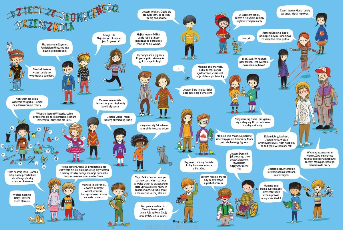 Witajcie w naszym przedszkolu! Tu się uczymy i bawimy. Ignaś lubi grać w piłkę, Maks jest specjalistą od dinozaurów, z Krzysiem, moim ulubionym kolegą, wciąż robimy jakieś kawały. Zosia z kolei wiecznie coś gubi, a Wiktoria wydaje przyjęcia dla lalek… Nawet mały Aleks zostawia czasem swoją poduszkę bezpieczeństwa i do nas dołącza. Poza panią Anią, wychowawczynią, są jeszcze pan Marcel i jego pies Bazyl. Dbamy też o kotkę Felkę – psotnica ciągle się chowa, a my jej szukamy. Chodźcie, musicie wszystkich poznać!