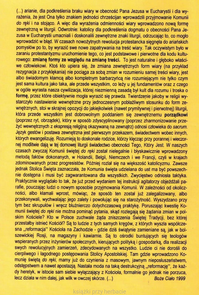 "Już św. Ignacy (†107), uczeń samego św. Jana Apostoła!, wołał, aby nie słuchać ludzi, którzy nam nie mówią o prawdziwym Jezusie Chrystusie. Bo oni: Stronią od Eucharystii i od modlitwy, bo nie uznają, że Eucharystia jest Ciałem naszego Zbawiciela Jezusa Chrystusa, tym ciałem, które cierpiało za nasze grzechy i które Ojciec w swej dobroci wskrzesił. Oto ci, co zaprzeczają darowi Bożemu, znajdą śmierć w swych zaprzeczeniach. Wiele osób - duchownych i świeckich - nie zdaje sobie sprawy, że próba wprowadzenia Komunii świętej do ręki jest kolejnym krokiem na drodze do zaprzeczenia prawdzie o rzeczywistej obecności Chrystusa w Eucharystii. Tam, gdzie zaprowadzono Komunię świętą do ręki, już się tak stało! Zatrutym owocem są nieprzeliczone, tragiczne przypadki (zamierzonej lub bezmyślnej) profanacji Eucharystii. W niczym nie zmienimy Chrystusowego kryterium: "złe drzewo rodzi zły owoc". Musimy się do tego kryterium po prostu stosować."