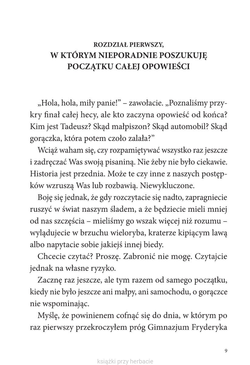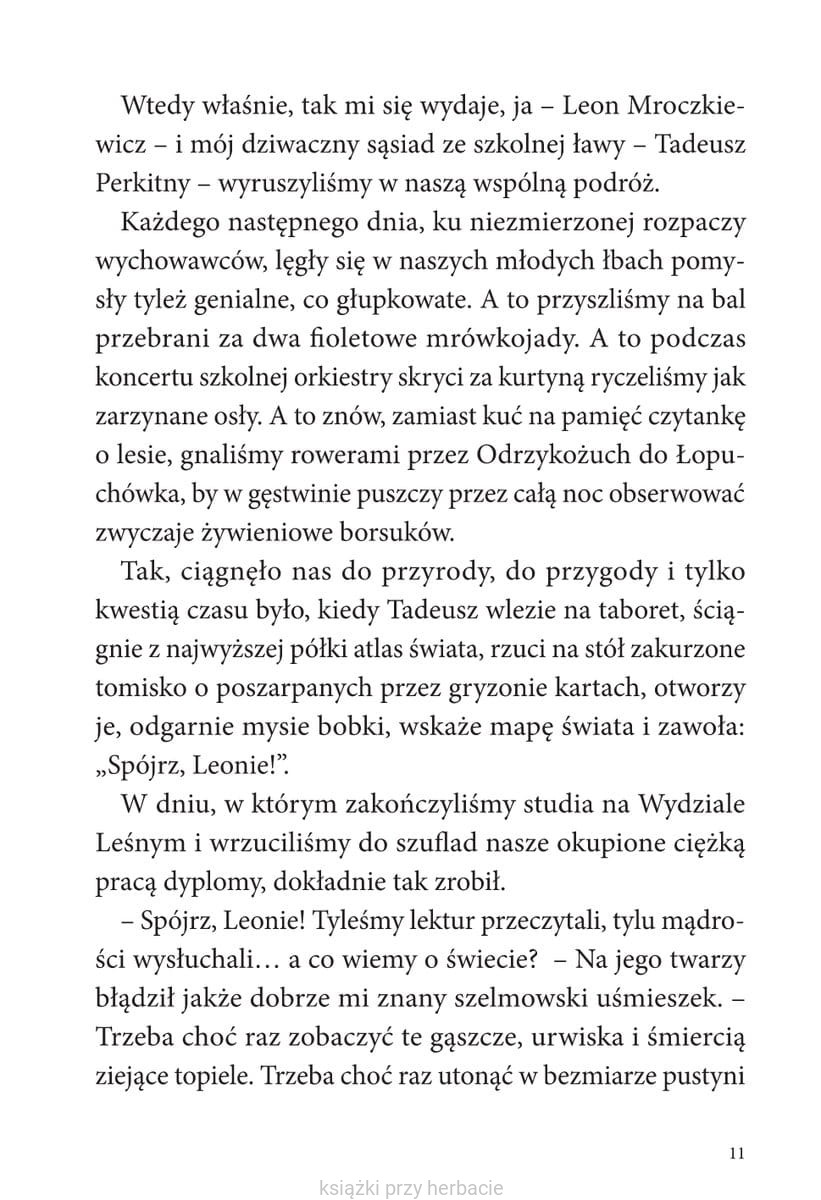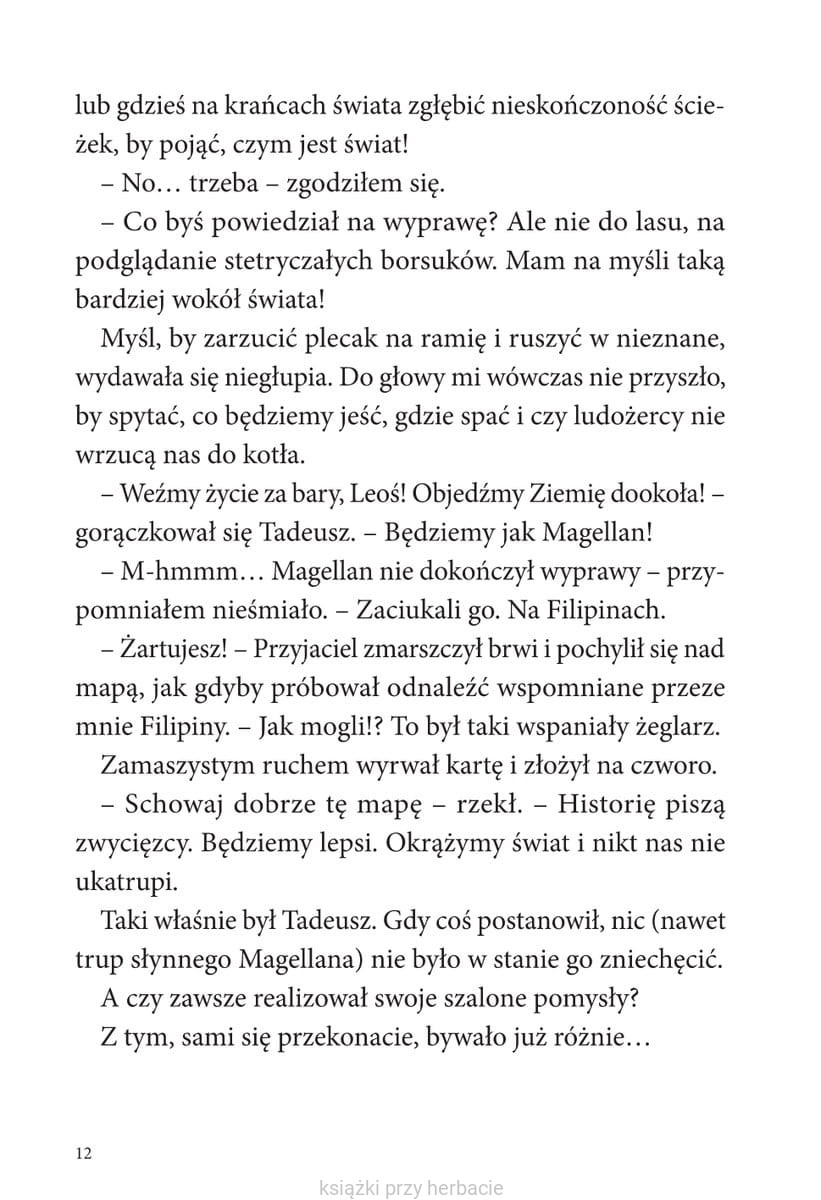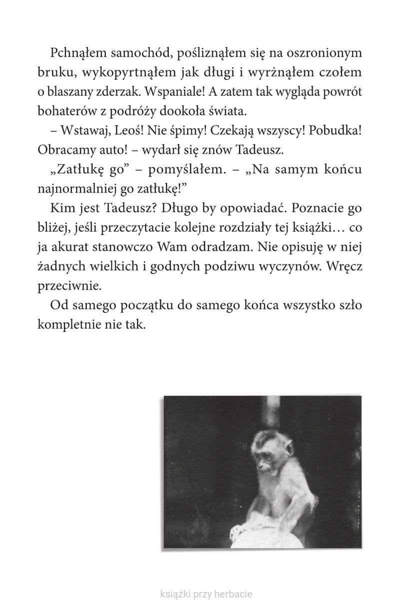 Był wrzesień 1926 roku. Leon i Tadeusz spakowali bochen chleba, słój kiszonych ogórków, kilogram jabłek i ruszyli w podróż dookoła świata. Bywało kiepsko. Głupot nawyczyniali po drodze tyle, że wstyd wspominać. Wyprali marynarskie majciochy, stoczyli walkę z truchłem krokodyla, jechali tyłem do przodu, nie ożenili się z księżniczką, dźgnęli scyzorykiem mordercę, zbudowali bambusową łajbę, która utonęła, a zdarzyło się i tak, że na gwałt potrzebowali trumny…